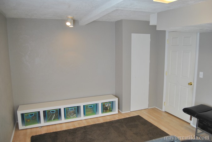 There are two unfinished spaces to the left of the stairs that we use for laundry and storage (and they aren’t worth showing you), but to the right is a large open room. We basically never used it in our 3 years here (*kicks self SO HARD*), but the plan was always to turn it into a combination craft/exercise/play room. We finally did it, just in time to sell the dang place.